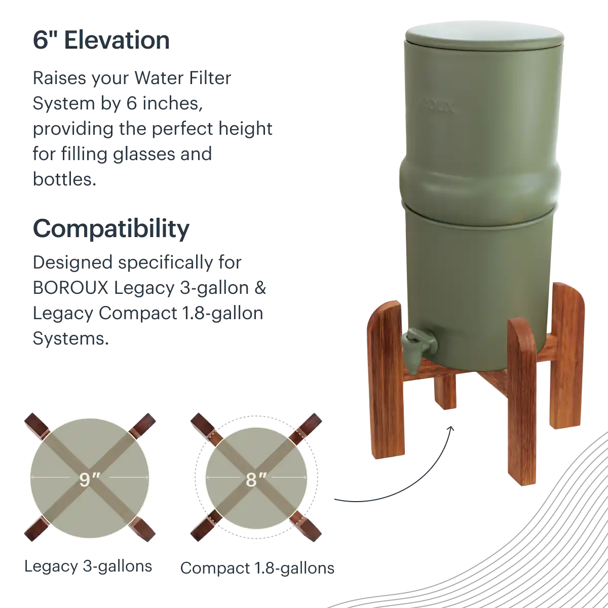 A sturdy base and beautiful finish, the BOROUX Wood Stand is a must-have accessory. Stylishly lift up your BOROUX system for easier access to filtered water. The six-inch stand opens opportunities to place the system in more places, no longer confined to a ledge. Teak wood is exceptionally durable and has a natural resistance to moisture. Creates the perfect hydration station.